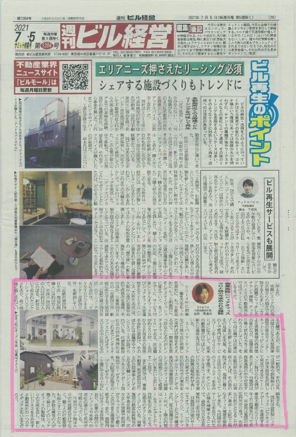 『週刊ビル経営』第1204号にて、弊社サービスオフィスSYNTHについて掲載して頂きました。