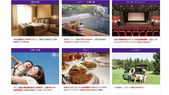ジムやゴルフ場、レジャー施設などの割引利用から、日本全国約20,000軒のホテル・旅館を優待価格でご利用頂けるなど様々なサービスがあります。