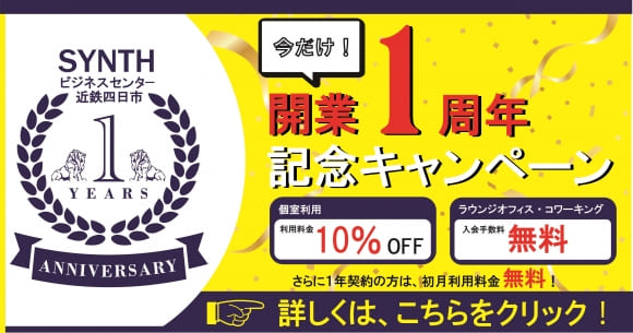 今回は、SYNTHビジネスセンター近鉄四日市開業1周年記念キャンペーンについてのご紹介です!