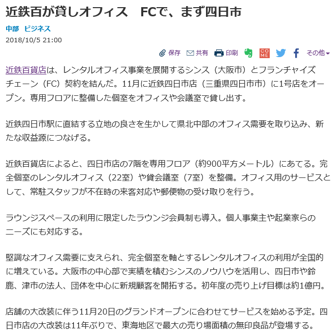 【プレスリリース】大阪・堂島サービス付レンタルオフィスSYNTH 近鉄百貨店四日市店にてフランチャイズ事業展開