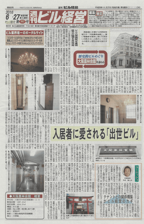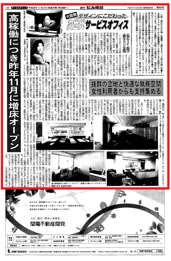 週刊ビル経営 第963号 (2016年6月27日発行) オフィスビル専門誌「週刊ビル経営」にて、デザインにこだわったレンタルオフィスとして掲載されました。 ![]() ワークスタイルの多様化に対応するオフィス |