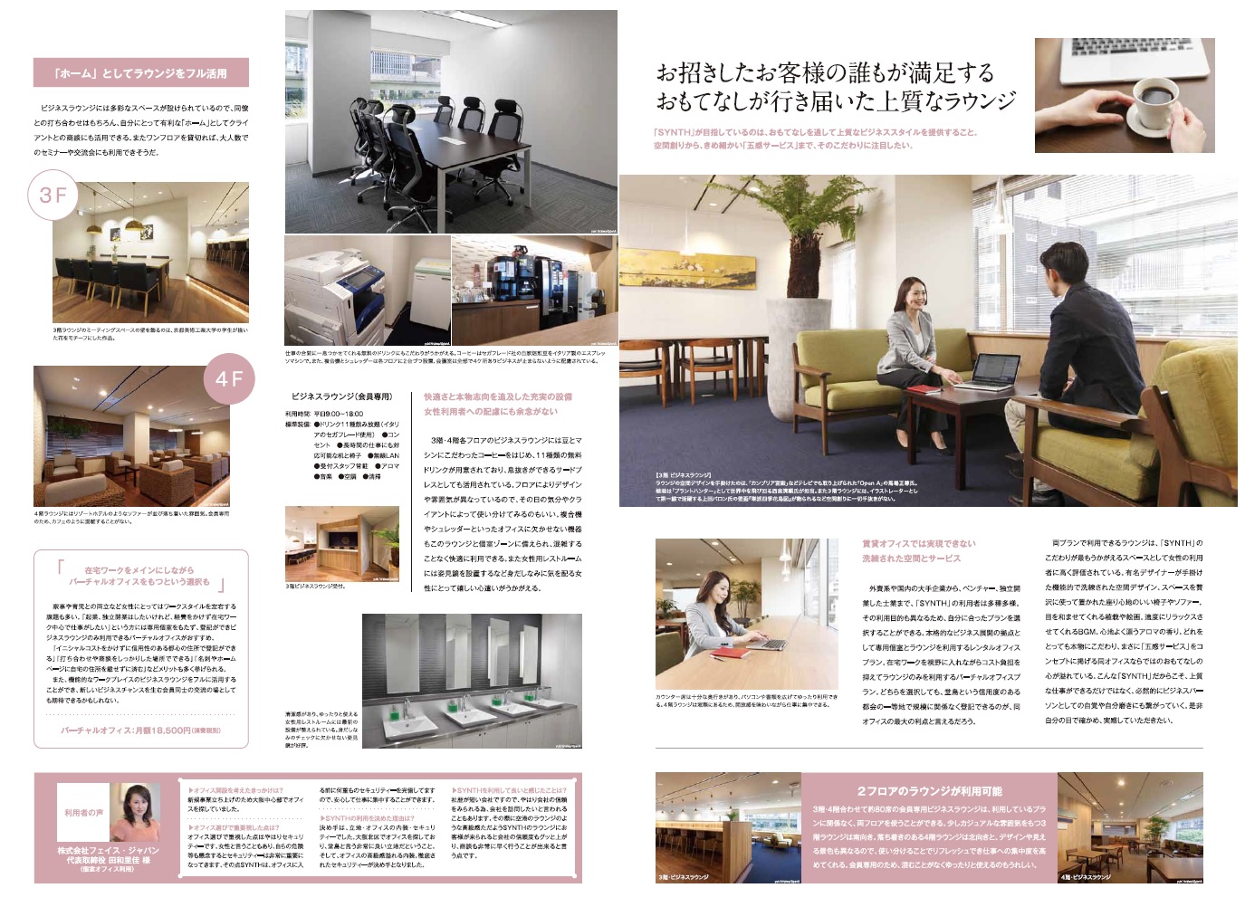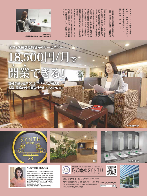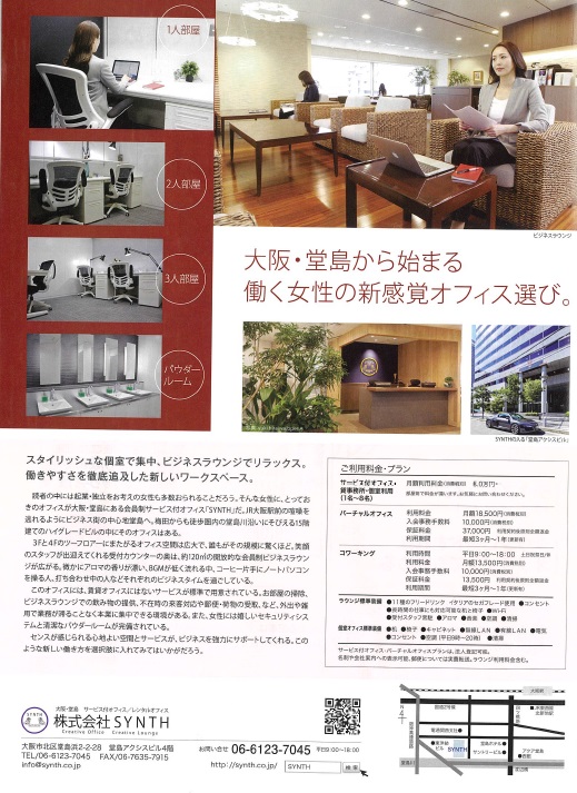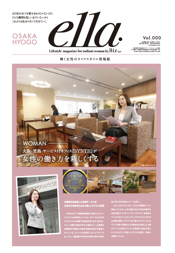 日経新聞 折込情報誌 「ella」 3月7日に配布される関西の日経新聞の折込情報誌「ella」(エラ)<兵庫・大阪エリアに配布>に SYNTHの特集号が組まれました。これからの「はたらく女性」をサポートする環境として 4ページに渡り特集されています。 【ella ~輝く女性のライフスタイル情報紙~】 「まだ私の全てを愛せるわけじゃないけど、 どんな瞬間も美しい女でいたいから これからも私はワタシで生きていく。」 ![]() ![]() 女性のレンタルオフィス |