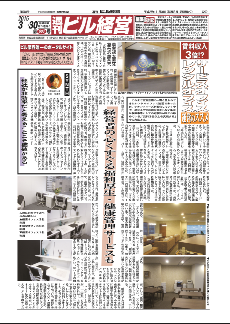 週刊ビル経営 特集 (2015年3月30日号) オフィスビル専門誌「週刊ビル経営」にて 「賃料収入3倍?!サービスオフィス、レンタルオフィス 運営のススメ」 という内容で特集記事として当社が掲載されました。 従来のレンタルオフィスでは実現できなかったハイグレードビルでのレンタルオフィス運営を 他社が非効率と考えるような広大なラウンジや、業界初の健康管理や福利厚生を含む各種サービスを 有能なバイリンガル秘書付きで提供することが注目されました。 ![]() 経営者のレンタルオフィス |
