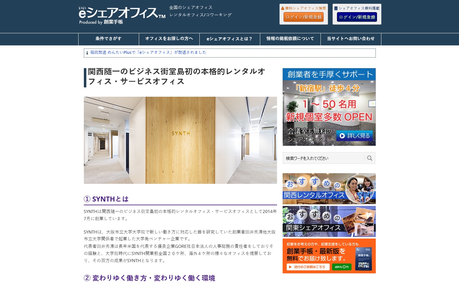 情報サイト eシェアオフィスに掲載 日本最大級シェアオフィス情報掲載サイトeシェアオフィスに おすすめの関西のレンタルオフィスとして掲載されました。 http://eshareoffice.jp/sp-synth ![]() おすすめのレンタルオフィス |
