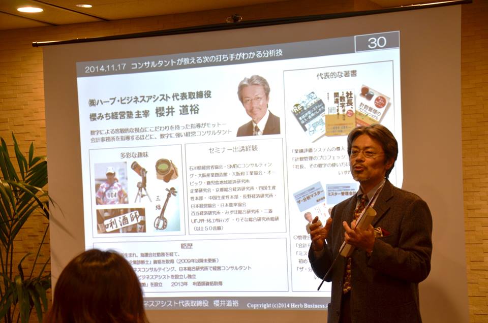 今回、ビジネスセミナーで講演いただいた櫻井道裕先生は、数字にこだわった客観的な事実に基づく経営指導のスペシャリストです!銀行系セミナーや経営者団体主催のセミナーに1000回近い出講実績をお持ちで、会計事務所を指導するほどに数字に強い経営のコンサルティングをなさっています。
